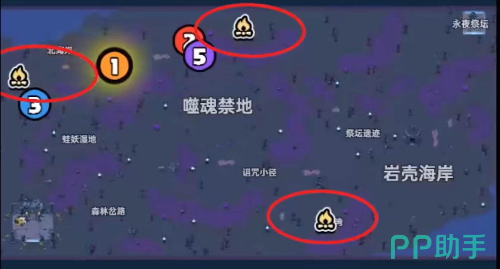 森林地图的入侵位置如下图所示,一共有三个地点。如果图中三个位置都没有遇到,那么就是在最右上角的永夜祭坛那里。