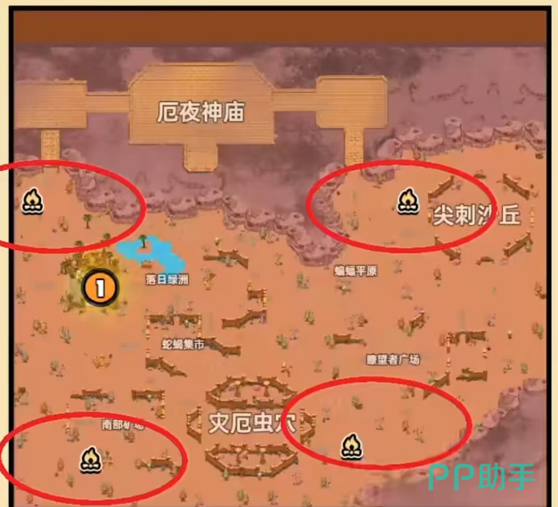 沙漠地图的入侵位置如下图所示,也是有四个,分别在落日绿洲的左上方,蝙蝠平原的右上方,南部矿场的左下方以及灾厄虫穴的右侧。