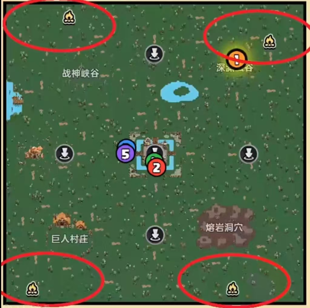 小镇地图的入侵位置如下图所示,一共有四个,大家只要在这四个位置去蹲点就能遇到怪物。