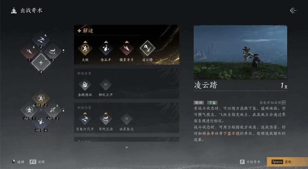1、大家在玩游戏的过程中,如果能够熟练运用凌云踏的小技巧,那么就可以帮助玩家在室内跳到一些比较高的地方。首先大家在获取奇术凌云踏后,需要先将它装配到奇术栏内。在使用凌云踏释放的过程中,除了防守外其他动作是插入不了的,不过要注意小编说的防守而不是泄劲。在凌云踏释放后,防守是可以打断的,那么如果前面有可以爬的障碍,按住W键是可以爬上去的。