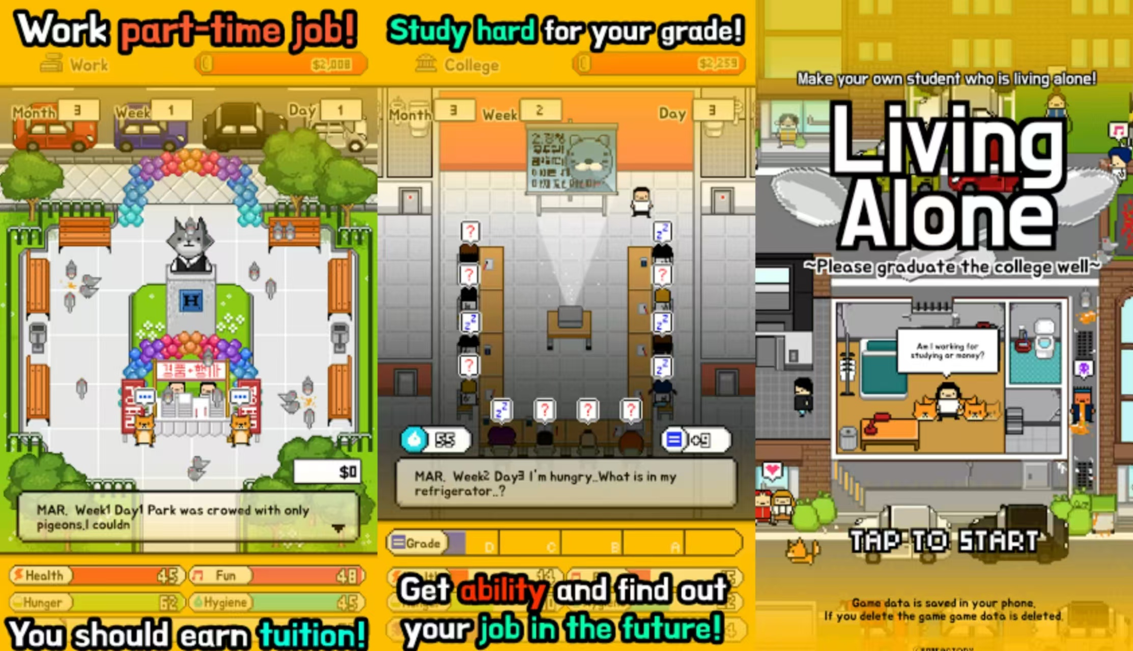 《独居》在游戏里面玩家扮演的是一位普通的大学生,在经过毕业之后一个人在社会上闯荡的情节,拥有着一份非常忙碌且稳定的工作,需要在游戏中通过自己的努力买房买车,还有很多生活中的琐事,模拟了一个真实的生活状态。角色拥有着健康,饥饿值等情况,玩家也需要通过任务来保持良好的心情,在游戏中赚取更多的钱来提升居住的环境。