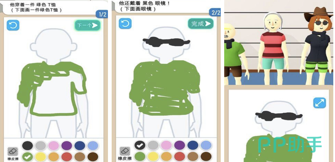 在极简画风中,玩家主要通过素描这一手法展示出绘画作品。绘画的对象是一名罪犯,玩家需要仔细听受害人对罪犯的描述,将罪犯的五官构成以及整体形象绘画出来。在颜色功能盘中,玩家需要为眼镜和衣服等多个部位上色。当罪犯的整体画像完成后,玩家可在提供的NPC中找出对应的罪犯。