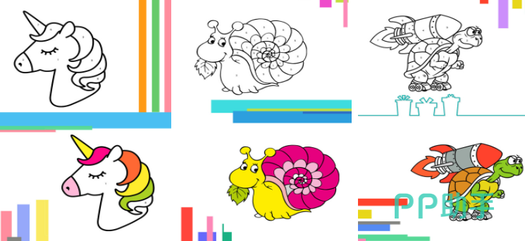在极简风绘画背景中,页面上部分有物体最基本的素描图片,玩家可根据已经提供的颜色在页面下方对该物体涂色绘画。物体的种类比较多,小马及乌龟等多个小动物最为常见。在涂色方面,每一种颜色比较大胆,有时候小乌龟身上还背着一个火箭,玩家可大胆发挥自己的创造力以及想象力。