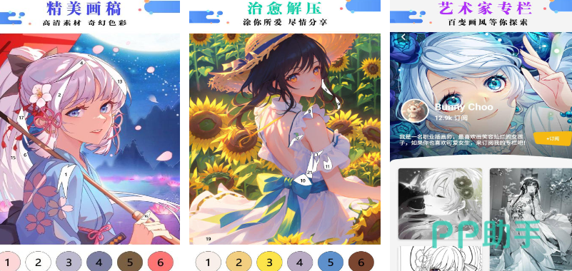 画作的种类比较多,带有日系解压的精美画风受到玩家追捧,各种二次元美少女的精美画稿的素材非常丰富。在艺术家专栏中,玩家可选择黑白以及更多画风来展示画作。每一幅画作完成后,玩家可根据下方提供的六个不同的色系进行涂色,让整体的视觉效果更加充满艺术气息。