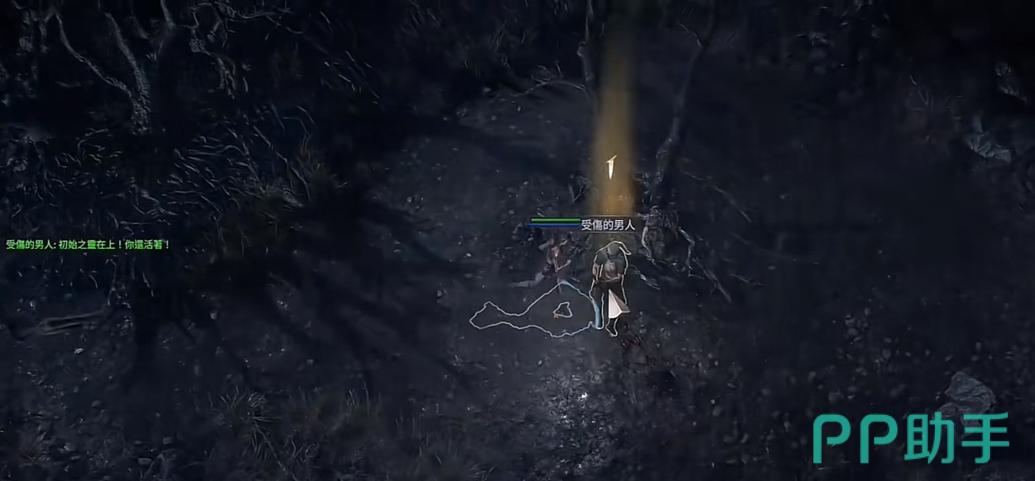 初始地图河岸,该地图需要我们完成三件事,第一解救老头获取初始武器,第二与头上带感叹号的大箱子进行互动获取初始技能,第三跑到地图尽头击杀第一个boss,然后前往下一个地图接发营地;与萤娜进行对话,接取任务噬魂之书,前往下一张地图接伐。