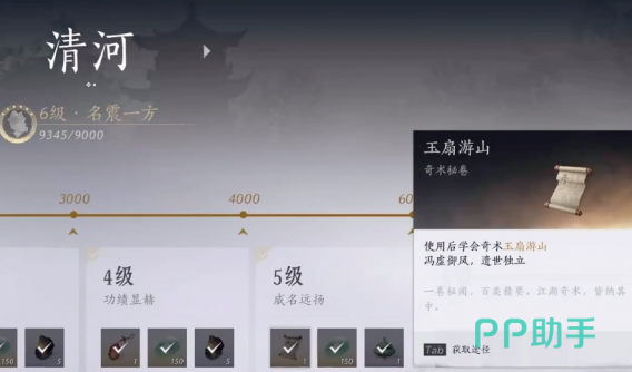 玩家还可以选择去提升探索度,然后去得到大轻功。如果清河探索度已经达到4000点,那么此时玩家还可以获得暮云佩,这也就是大家所说的玉佩,另外如果探索度已经超过6000。还可以额外的获取玉扇游山,如果玩家的探索度已经达到了7000,那么还能够获得冯虚御风。