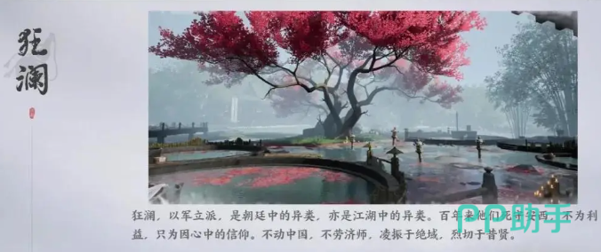 狂澜:是一个擅长水元素,而且门规严谨的门派,主要是以长枪作为武器门派,也要求每一周饮酒的次数不应该低于10次,并且保证不能喝醉。