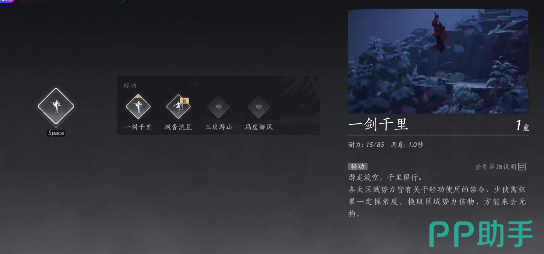 在获得一剑千里之后想要使用它还需要一定的条件。想要使用轻功需要玩家完成清河的探索度,探索度到4000就可以使用轻功了。另外还需要玩家获得轻功道具暮云佩,这个在清河探索度界面就可以看到了,探索度到四级之后就可以获得了。