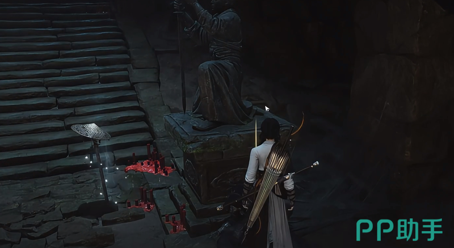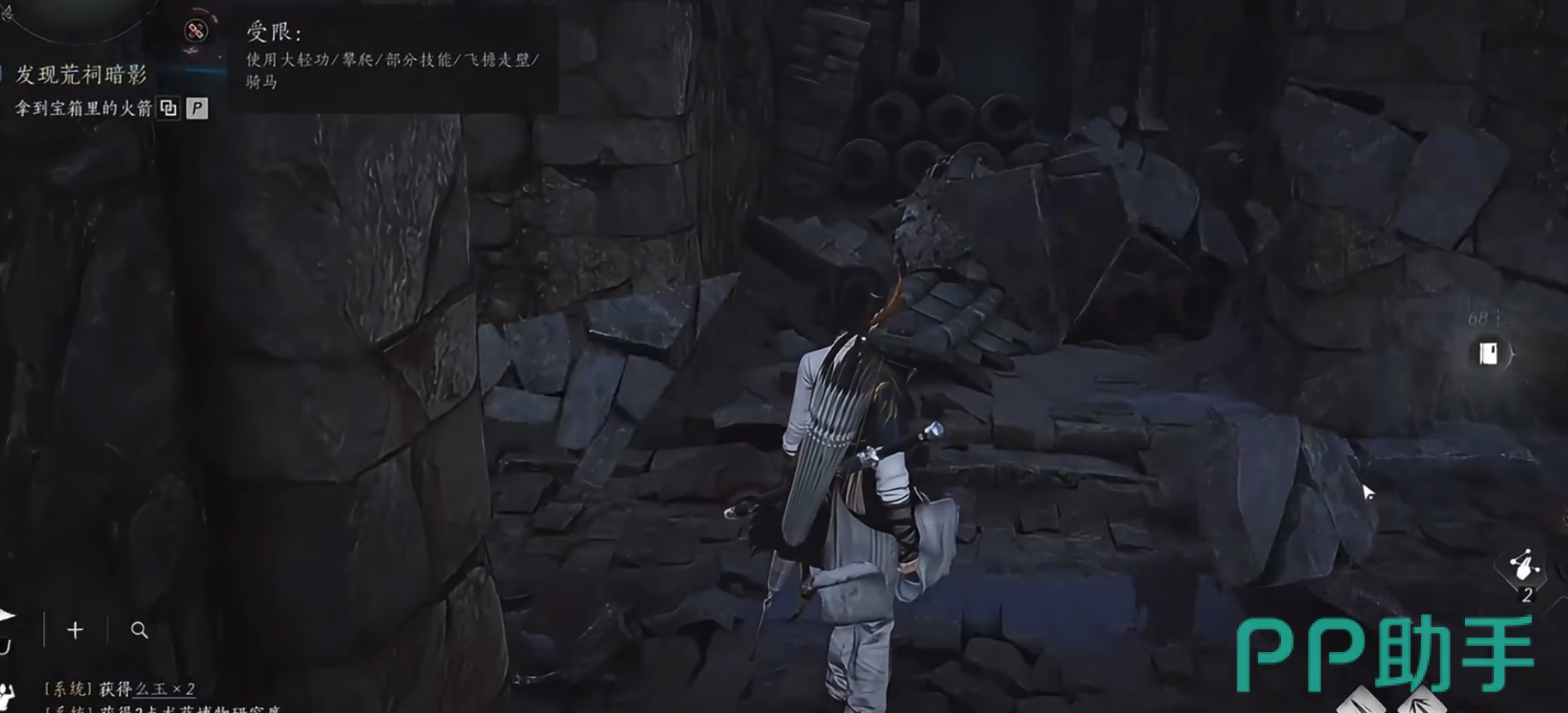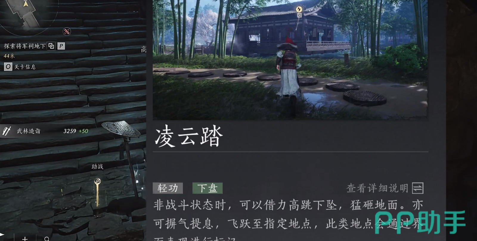 接下来就是凌云踏的获取流程了。这个获取流程非常简单,首先我们来到将军祠,这里有个npc,在npc的旁边有一堆碎石,我们利用千斤坠砸向碎石,破开碎石之后我们会往下掉进一个洞里。接着按照指示来到阶梯前,对着楼梯口的尸体完成探索之后,就可以获得凌云踏了!