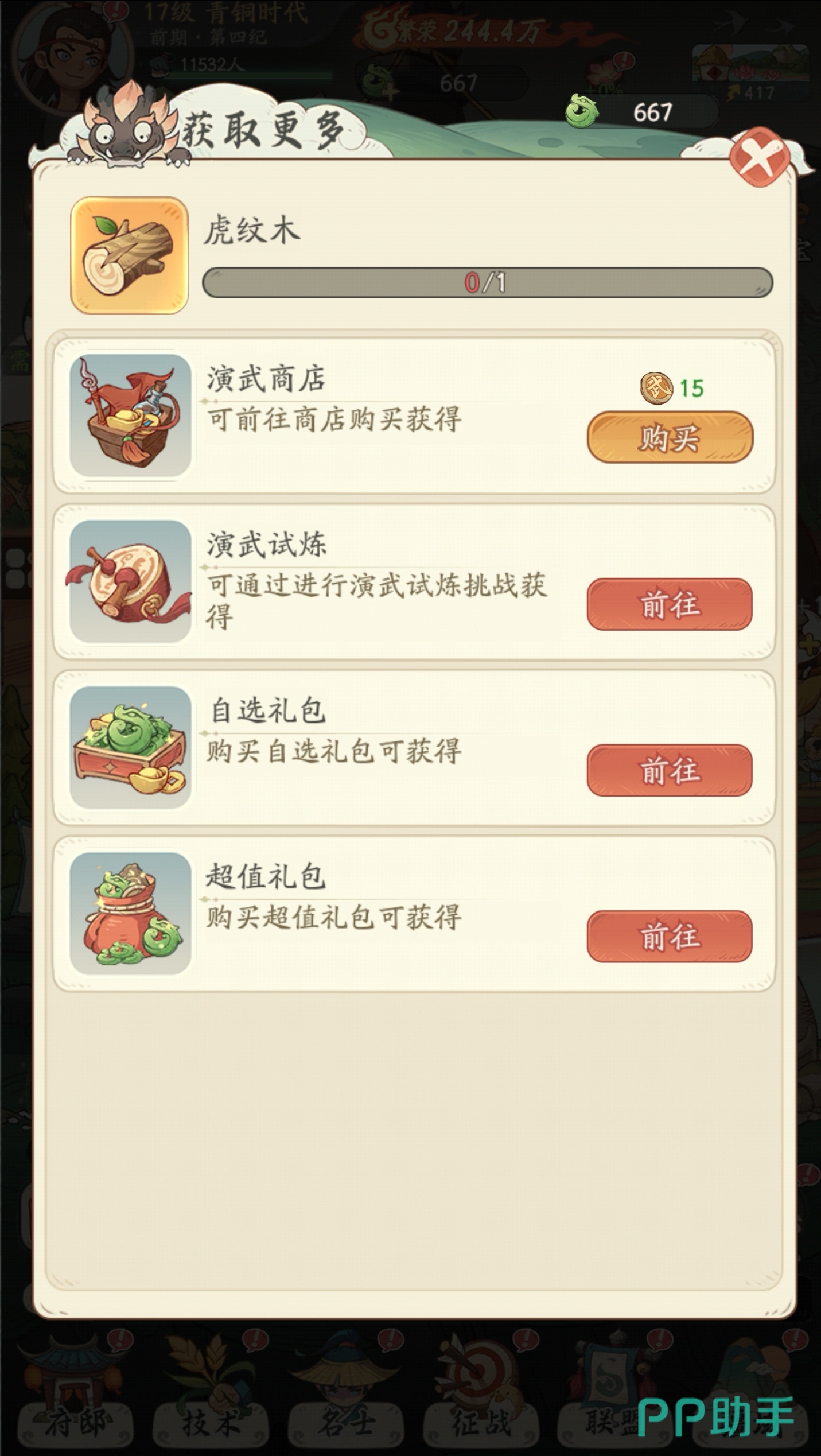 在升级座驾的过程中,会消耗大量的虎纹木,要是你把手中的虎纹木用完了,想要补充一些,那么可以通过购买礼包和参加演武试炼这两个方法来获得,演武试炼每天可以参加六次,每次你都需要自行选择对手,将其击败之后,即可获得规定的奖品,其中还包含一些演武币,使用这些货币能在演武商店内兑换自己所需的各种物品和道具。