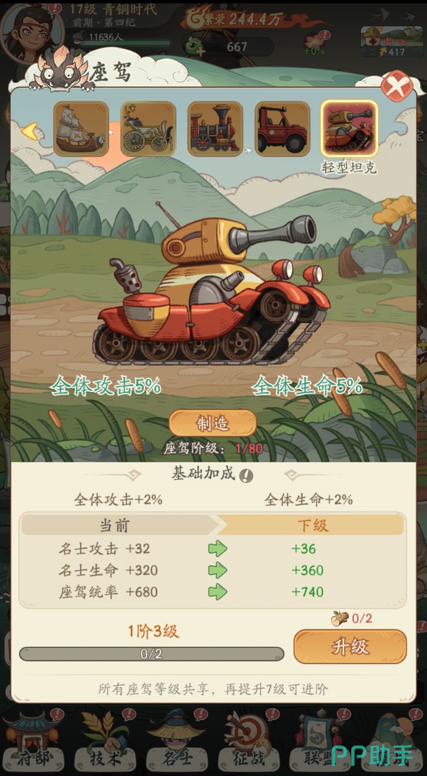 在后续的游戏过程中,你可以消耗虎纹木去提升座驾的阶数和等级,当等级和阶数升到指定的级别后,就能得到更高级的座驾,比如轻型坦克、合金吉普、西洋马车等等,这些高品质的座驾,能带来更多的属性加成,使你的队伍拥有更高的战力,就算面对厉害的对手,也能不落下风,轻松地将其拿下。
