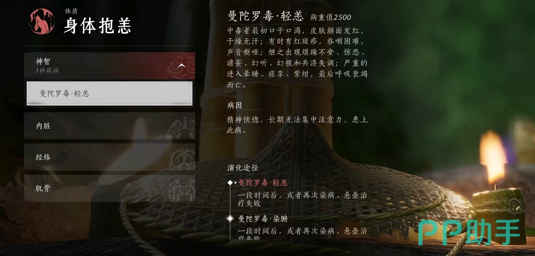 在经历一段短暂的动画之后,身上所有受伤状态就都可以被治好了,治疗当然需要花费一定的代价,只需要花费铜钱就能够治疗成功。治好之后再查看一下自身体质,就已经到达了身强体健的程度,4个选项也都属于正常,然后就可以开心的继续探索与战斗了。