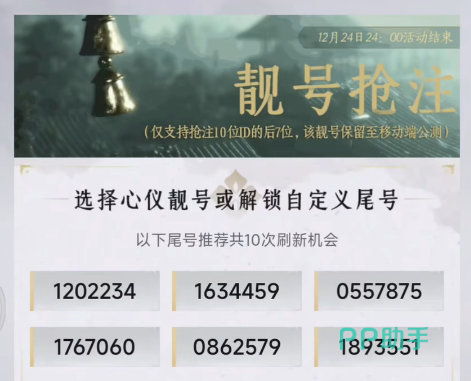 在燕云PC端公测前有举办过一个抢靓号的活动,就类似于汽车上牌,玩家登录后会给到6个靓号供选择,一共可以刷新10次。注意这里的仅仅支持抢注10位数ID的后面七位数。