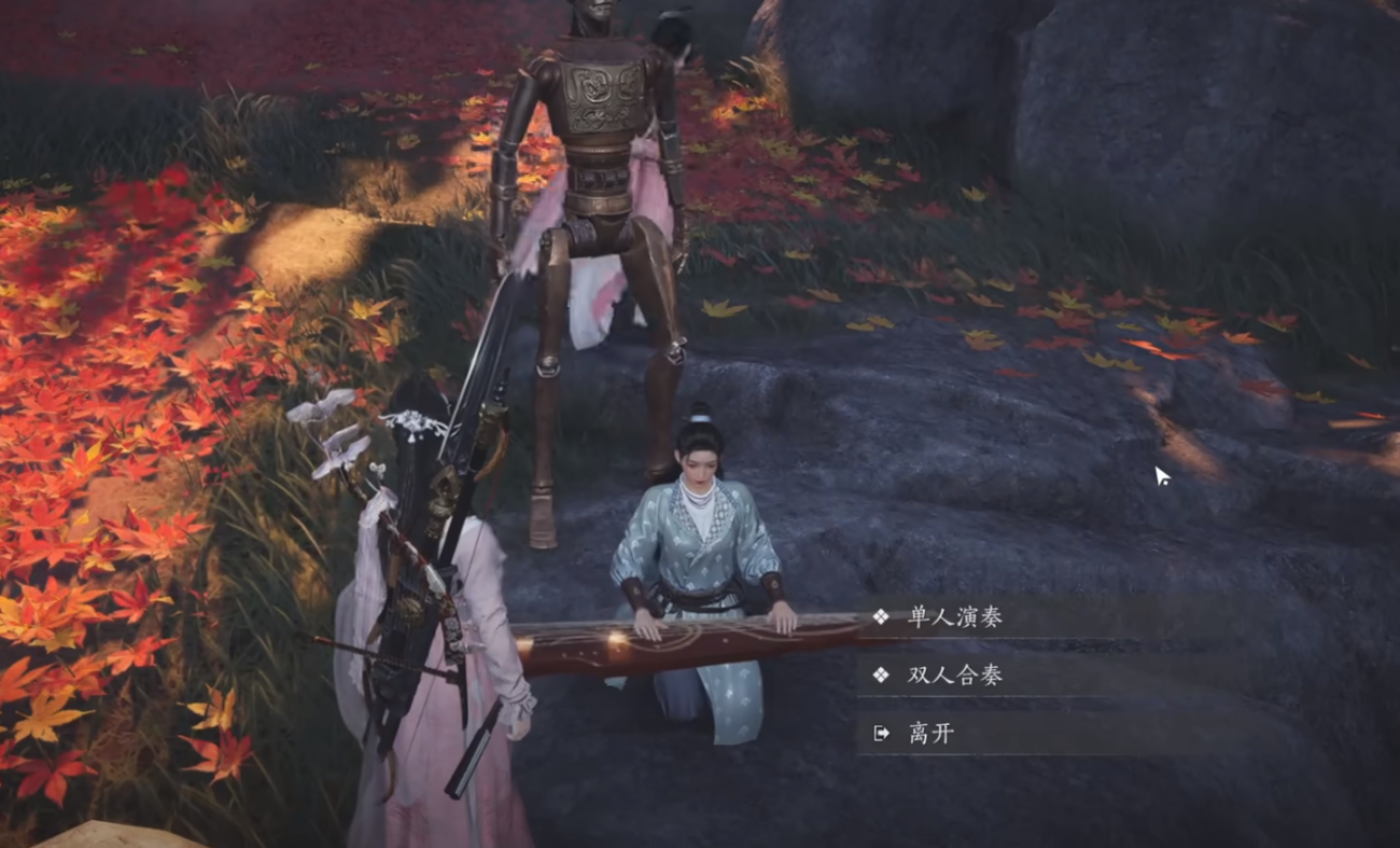 做完这个任务以后,再点击地图传送回丹崖,做丝竹雅韵任务。小地图东边走,可以看到npc舒舟坐在石块上弹琴,玩家靠近以后就可以触发单人演奏或者双人合奏,这是一个比较简单的音游玩法。