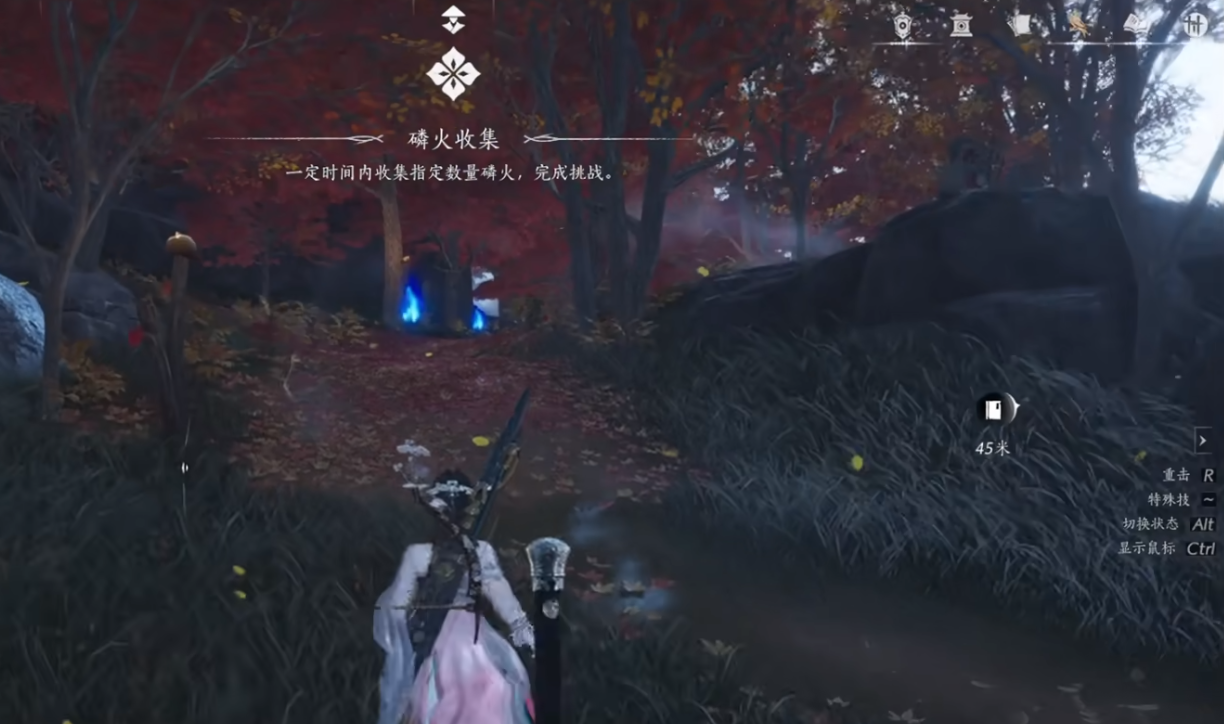 接下来在路碑附近,追逐蓝色的磷火,触发“磷火收集”任务。在屏幕倒计时50秒内收集指定数量磷火,一共要收集12个,大家要适当使用冲刺以及轻功技能跑路,总的来说还是比较简单的。