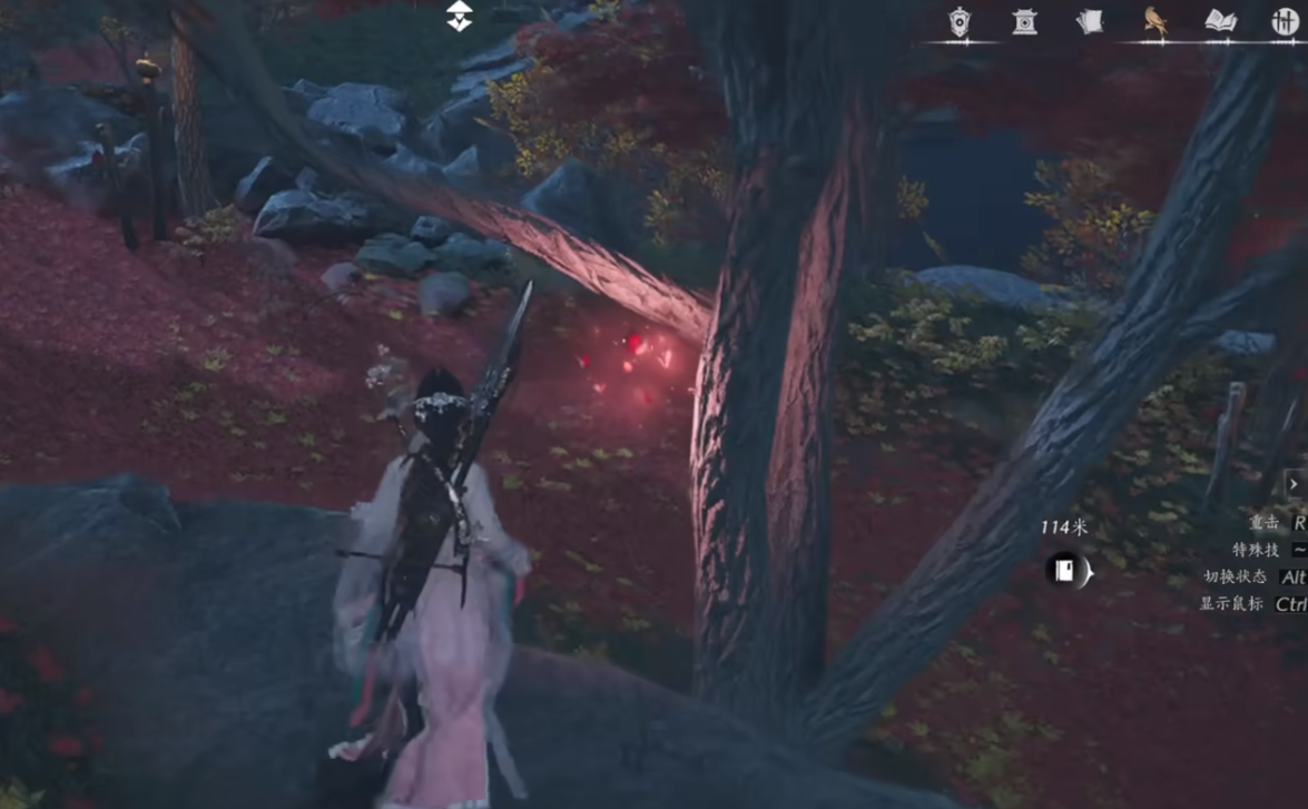 然后,在小地图往北方走,追逐红色的蝴蝶,它会引导你去下一个路碑,大家确认激活即可。激活以后再有一条红色的线条,引领玩家们走入树林,就有第二个路碑,成功激活即可收集8个长鸣玉奖励。