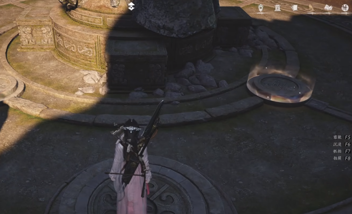 接下来下一个任务就是跟随npc天不收进入湖底,不过小编推荐玩家来到湖底时先不急着进入,要过神像后面找天不收再对话一次,触发一个研究奇怪盲女雕像的支线任务,玩家依次踩踏湖中雕像的大小发光圆圈即可。