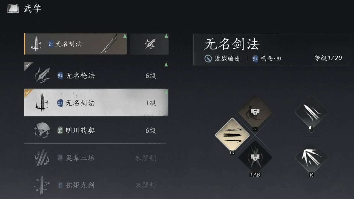 如果此时使用的武器不是剑,需要将武器切换成任意品质的剑,并将自己的武学给切换成剑法武学,比方说无名剑法等,最后施展出剑法武学招式就可完成此第一阶段,第二阶段需要前往丰禾村皮影戏摊附近。