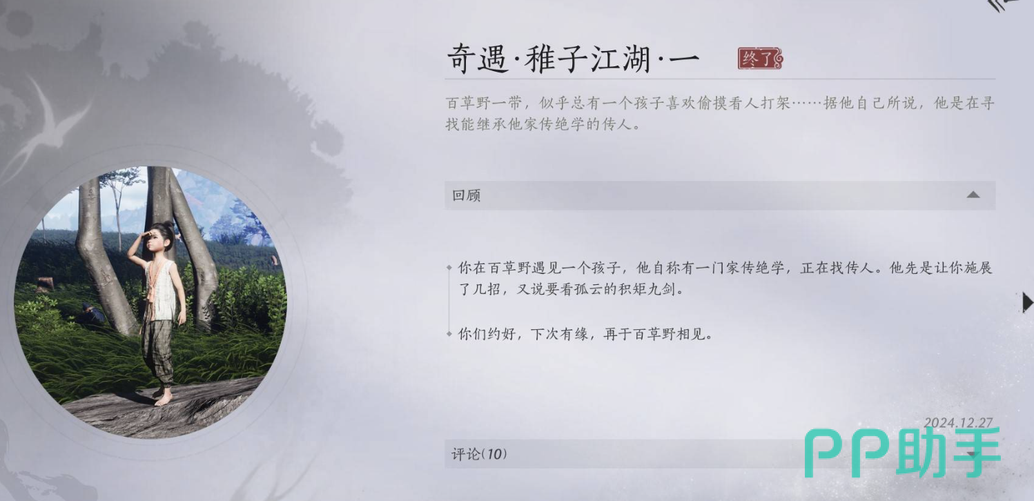首先这个任务是分阶段的,且都需要我们自行找到儿童触发,第一阶段触发的位置在将军祠附近的营地,我们先清理掉据点中的敌人,然后和旁边的小孩子对话就能触发接取,跟随指引找到小平安和他进行对话,从对话中得知他想看我们施展剑法。