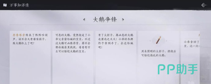 这时就可以在她的带领下去驱赶大鹅了,找到大鹅后记得一定用物品中的火折子,将其点亮大鹅就会乖乖溜走,而且还会掉落小乖的木牌这个重要物品,将木牌给还给刘小乖任务就算完成了。