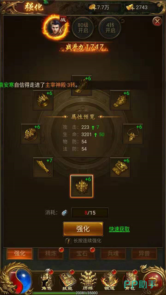 装备锻造分为装备强化、装备精炼、镶嵌宝石、兵魂和异兽。装备强化的是装备槽,不因装备的改变而改变,需要消耗大量的强化石,强化石只能通过装备回收获得,长按可连续强化;装备精炼消耗精炼石,可从野战和野外boss处获取。兵魂和异兽要角色达到四转后开启。