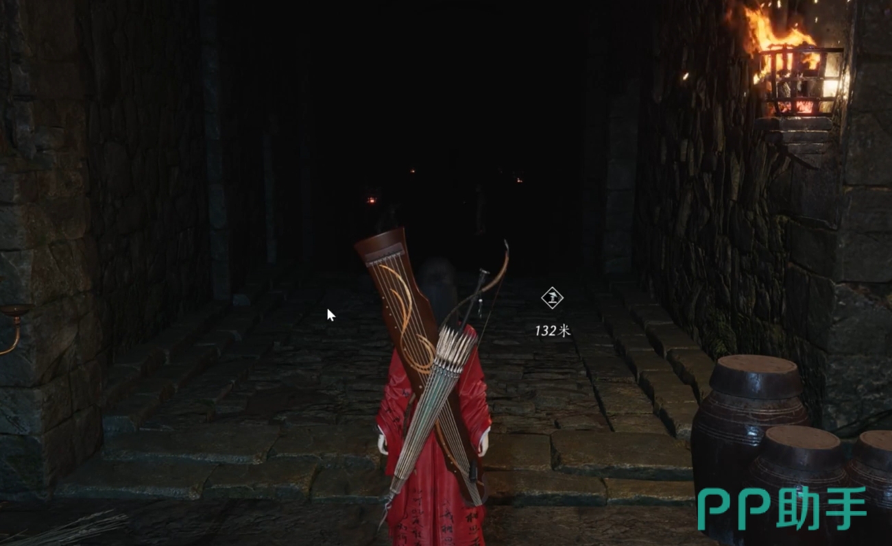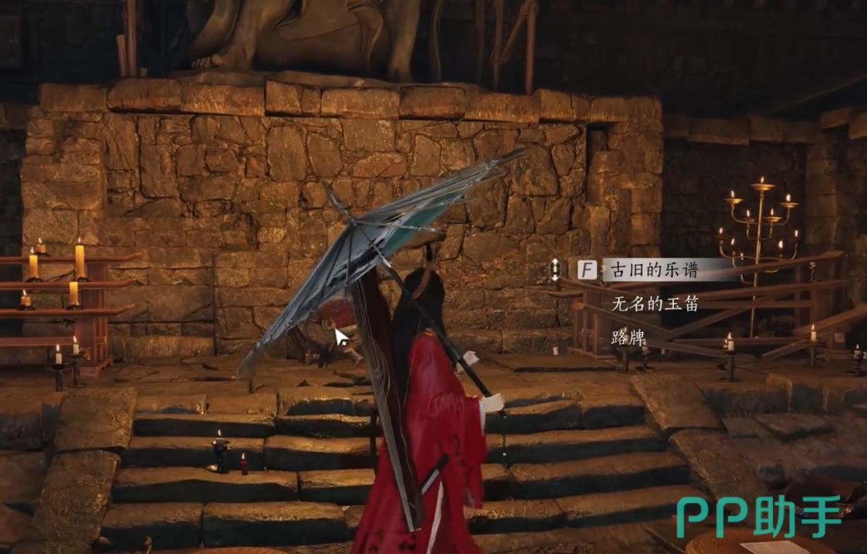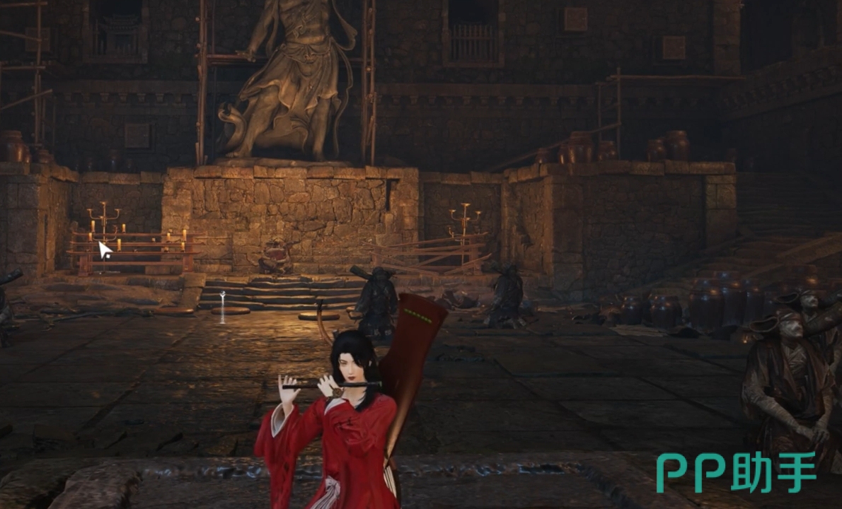 当玩家们进入弱水岸后,会在这里遇到非常多袭击玩家们的无面人,并且任务所在场景非常昏暗,需要人们不断利用火箭来点燃火把进行照亮。顺着地道一路战斗便能来到一处比较亮堂的大厅,这里除了有一些不会攻击玩家的无面人外,还能找到一份乐谱和一支玉笛,这就是将要进行的吹笛子任务。