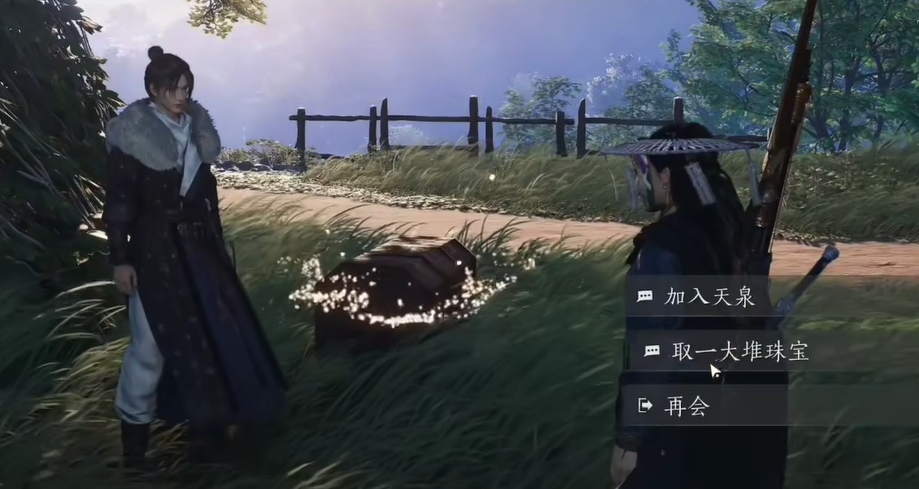 这里要特别提醒少侠们一个陷阱:途中有个天泉长老会假惺惺地劝你加入九流门。别被这家伙唬住。这只是个假冒任务,想要正经加入天泉派,必须选择【不满意我要退出】的选项。退出后,会触发战斗——需要击败天泉长老和他的九流门弟子。胜利后,别忘了搜刮旁边的宝箱,你会额外获得一笔“不义之财”。这笔钱将为后续任务铺平道路。