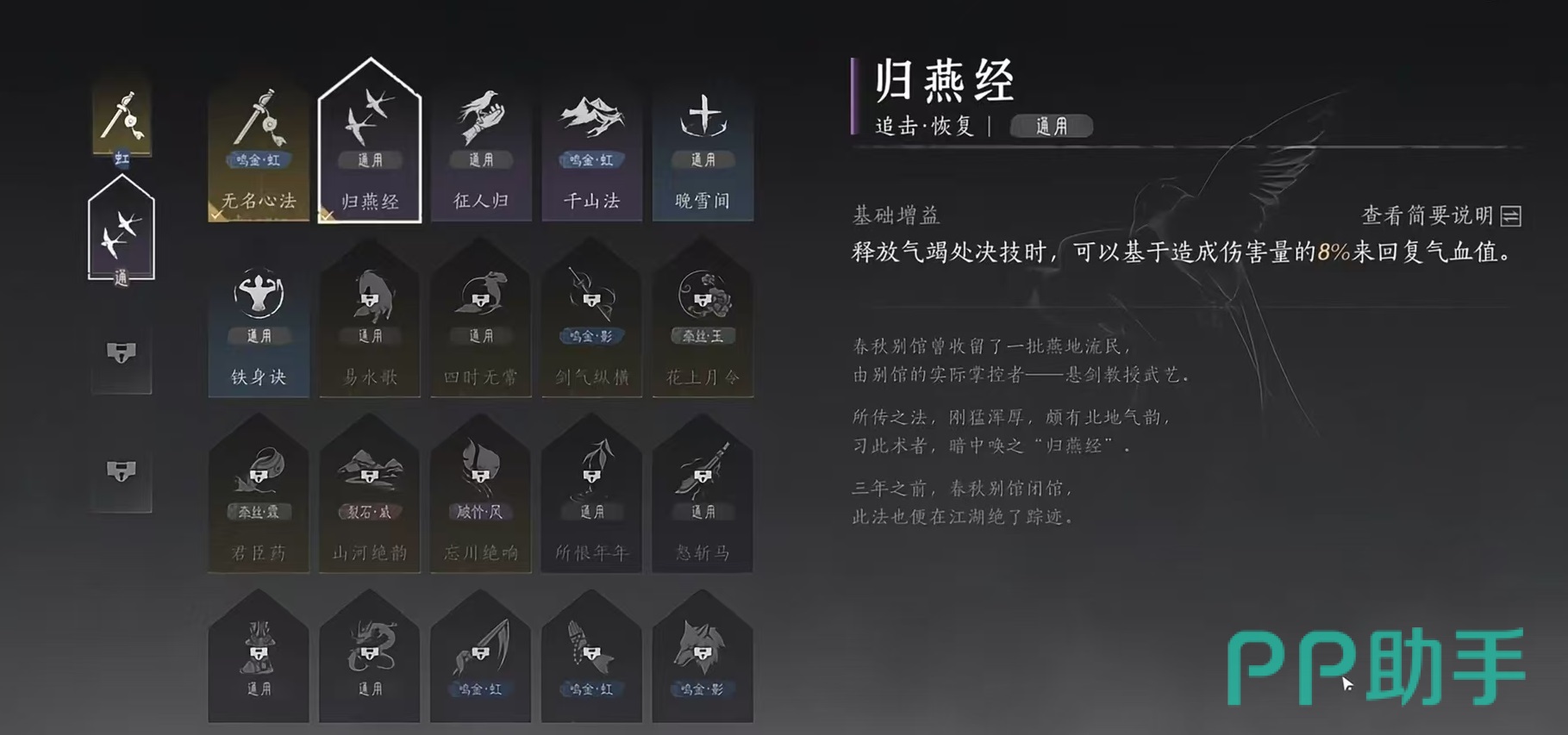 为了能够帮助大家在游戏中的尽量多地获得各种心法用于搭配武学进行战斗,所以小编将一些比较重要的心法获取途径进行讲解,今天就来看一下燕云十六声归燕经怎么获得。归燕经是应用比较广泛的一项心法,而且获取的途径也比较简单,只需要通过战斗就能直接获得。