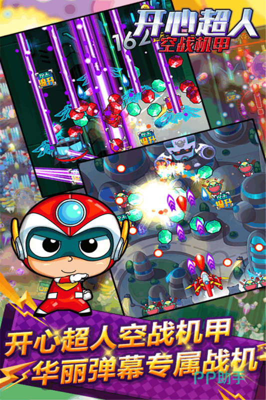 《开心超人空战机甲》是一款以我们非常熟悉的动画片改编而来的飞行射击游戏,这款游戏中我们熟知的各个超人角色都被还原在了游戏中,而且每一个超人都有自己的专属机甲,不管是性能还是外观都与超人完美匹配,游戏中主要的游玩方式是弹幕射击,因为游戏中的道具以及增益效果众多,所以玩家打出的弹幕效果可达上千种。