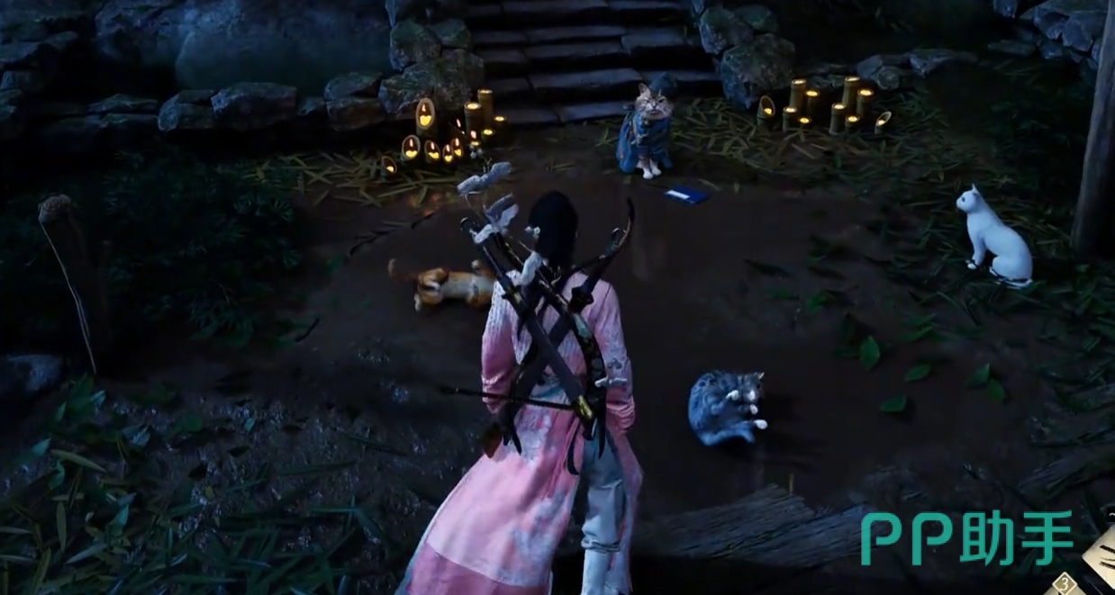 其中,第一只猫咪在将军祠的传送点向前走,翻过红墙后即可看到白猫。第二只猫咪需要大家绕过祠堂后方,再次翻墙会遇到第二只猫咪,第三只猫咪需要大家向右拐进入山洞,与山洞中的猫对话,并将其引导至对应的石板上,完成小石像的搬运任务后,即完成此任务。