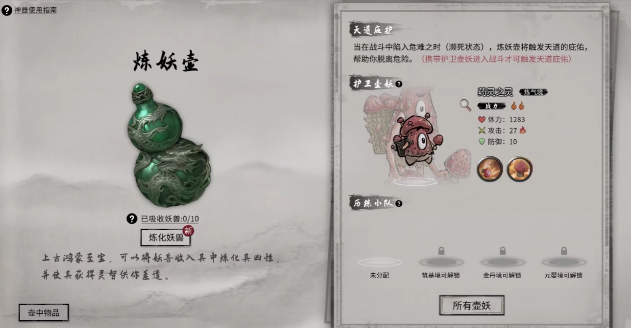 上面的这些内容就是本次小编给大家带来的鬼谷八荒能化形的壶妖盘点的全部内容了,如若玩家在前期的神器至宝当中并未选择炼妖壶,则不能够使用化形玩法,希望看完这次内容的小伙伴们,可以实际进入到这款游戏当中体验一下哦。