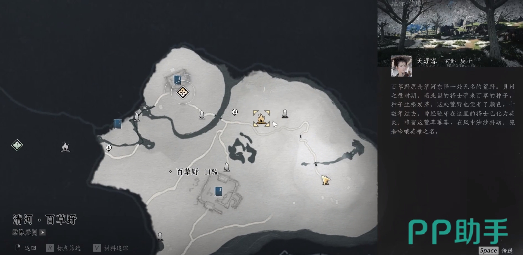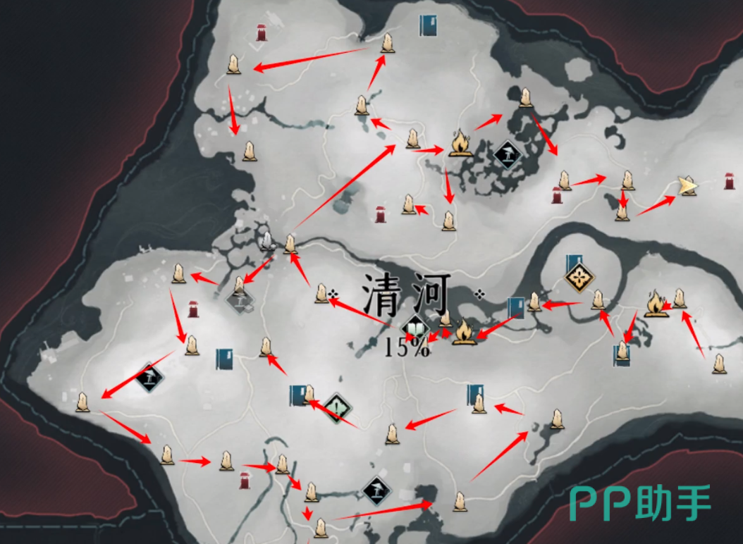 如果地图区域还没有解锁,那对应的界碑也无法看到,这时你需要前往火焰标识处与NPC天涯客对话,解锁区域地图后,界碑才会显示出来。比如清河百草野的天涯客是玄部·庚子。接下来小编分享清河区域地上界碑分布如图:
