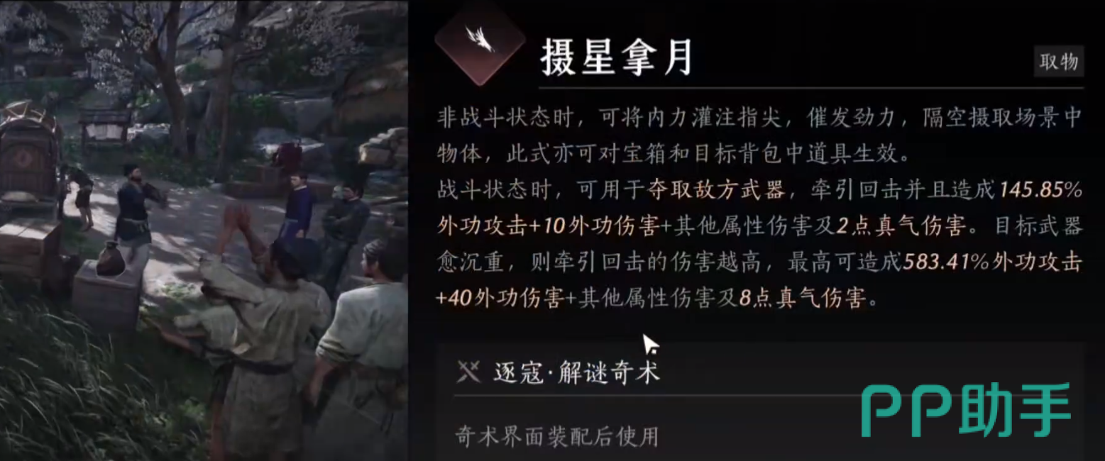 这是一种远程拾取物品的奇术,能够隔空摄取目标物品,在场景互动和战斗中都能发挥重要作用。在场景中,它可以用来从远处取物,比如隔着毒蛇拿取任务包裹等。而在战斗中,“摄星拿月”可以直接夺取敌方的武器,并对目标造成高额外功伤害。想要获得“摄星拿月”,玩家需要跟随主线任务前往神仙渡,在酒摊附近的空地上找到NPC仇越海,触发相关剧情并完成指定任务,即可解锁这一奇术。