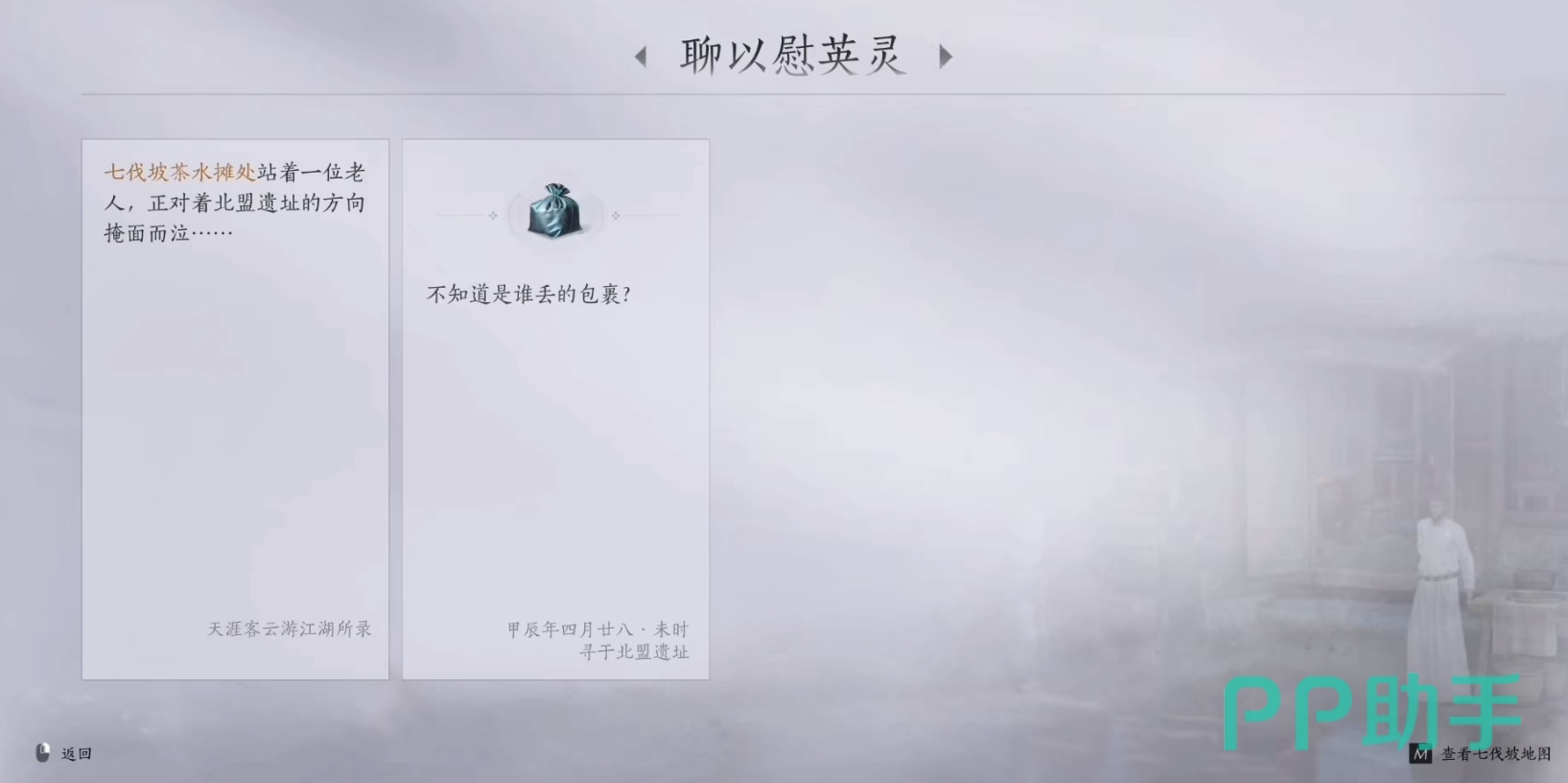 任务的第一步是前往地图上的七伐坡,找到NPC周爷爷进行对话,接取“聊以慰英灵”任务。对话后,周爷爷会指引你去寻找一个包裹。