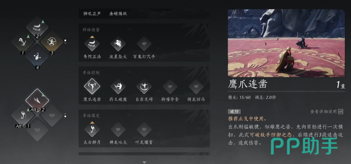 3、在看到老鹰之后就可以开始学习合适之后鹰爪连凿了,其实很简单就是进行观察观察,然后跟着系统的提示进行点击就行,等都点亮之后就可以学习这个技能了。这是一个非常强度的PK技能,非常值得学习哦。