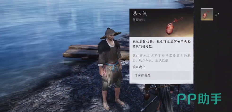 回到岸边再次对话渔夫,他要求你给一个【暮云佩】,这个只要探索度达到40%就能在地图探索度奖励中领取到。这样操作后就能在游戏中使用轻功这些技能了。