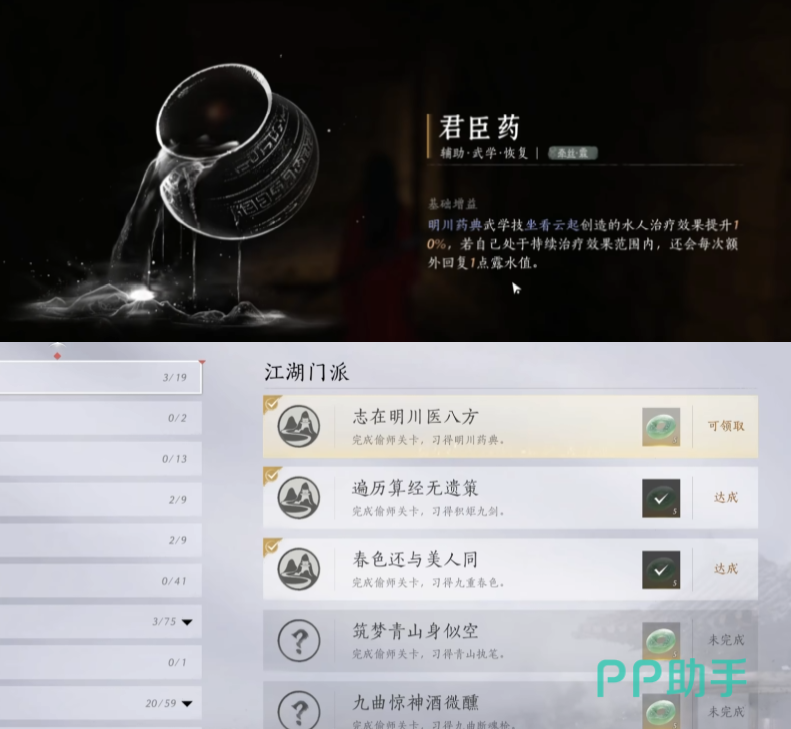 君臣药是辅助类的心法,可以提升明川药典武学技“坐看云起”创造的水人治疗效果,如果自身处于持续治疗范围内的话,每次还会额外回复1点露水值。这是一个金色心法,不仅获取相对容易,效果也是很帮的,可以说是绝对不能错过的心法了。