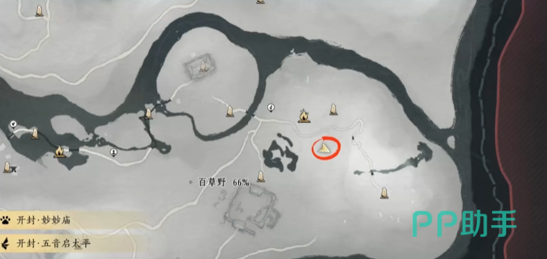 先是打开地图找到清河·百草野,找到如图红色圈圈标记的位置,是在竹林旧居附近。来到一处关闭的洞门前,使用游龙钥,放在前面的装置上打开洞门。