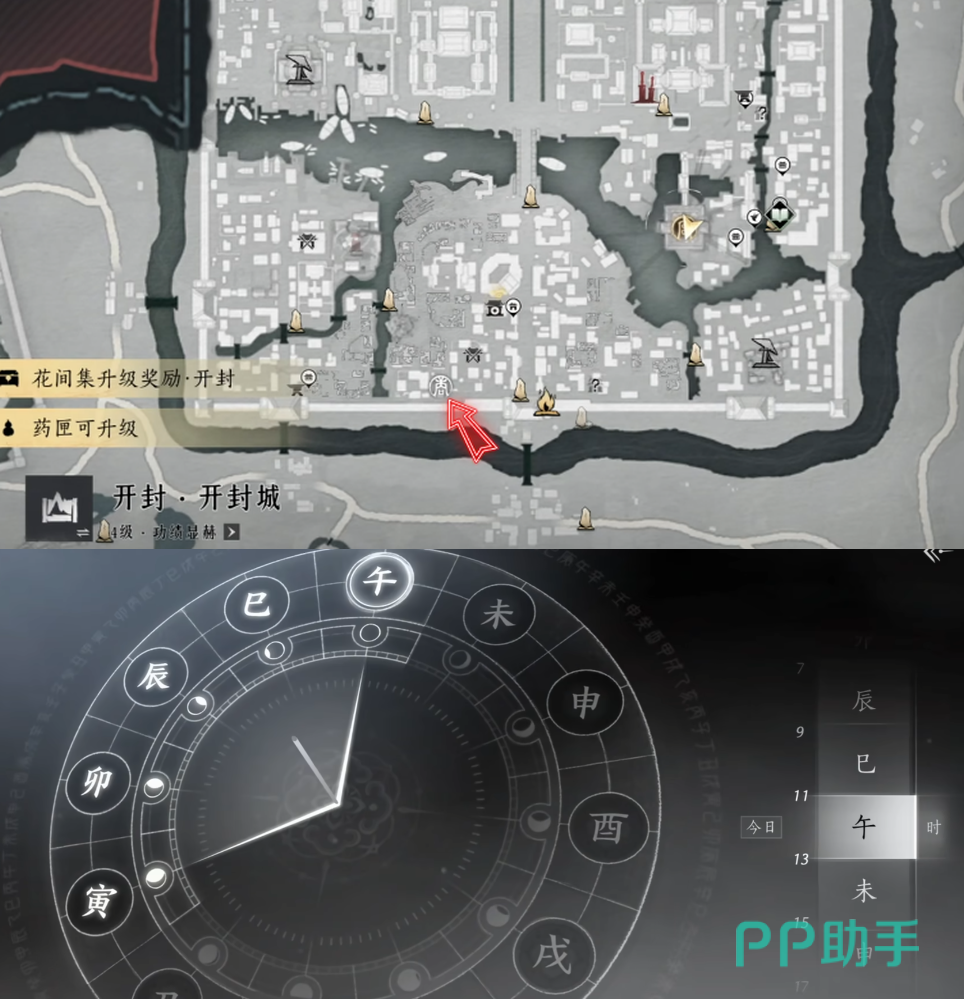 随后再前往开封城左下角,如图标记的位置,跟着指引来到巡检司附近,在一处卖编织框的商店门前,如果这里只看到了“熊二”,那么说明时间不对,在时辰中将时间改成“午时”。