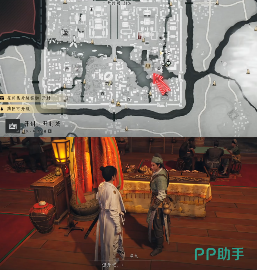在开封城地图中,如图标记的位置,与九流门的弟子“洛九”对话,会触发一个偷窃任务,洛九让玩家去将目标物拿回来会教玩家一招绝技,随后触发任务。