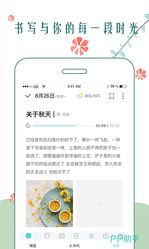 icity我的日记能够为大家提供更简洁且易用的日记书写功能,在这里大家能够有效地调整日记记录的界面,大家能够调整到自己喜欢的背景图片,让大家在日记书写过程中也有美好的书写心情。同时如果大家不想统一日记本中记录的文字字体的话,也可以针对特定的文字内容进行加粗或颜色调节操作,让整个日记的重点更突出。