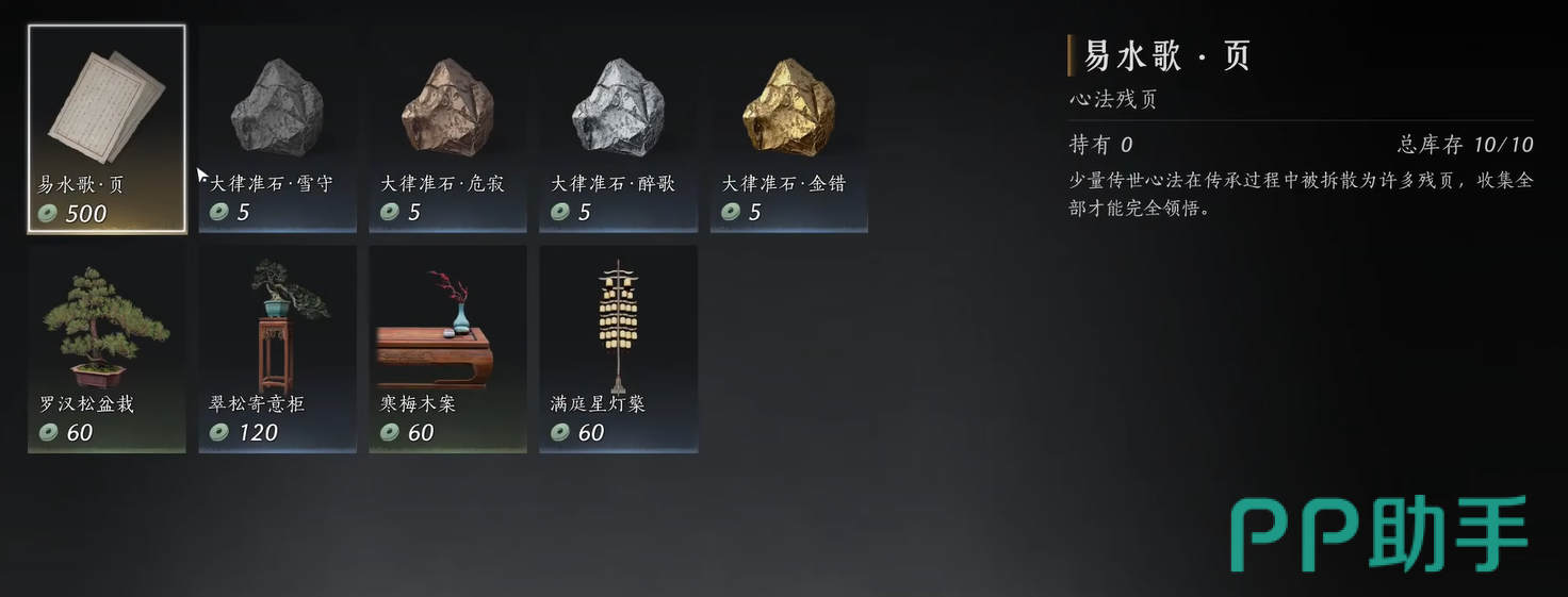 要想拿到完整的心法易水歌,首先得集齐10张“易水歌·页”,每张残页售价为500长鸣玉。换句话说,总共需要5000长鸣玉,才能凑齐这些碎片。心法虽好,但价格也不算低,因此建议提前积累足够的长鸣玉,以免一趟白跑。