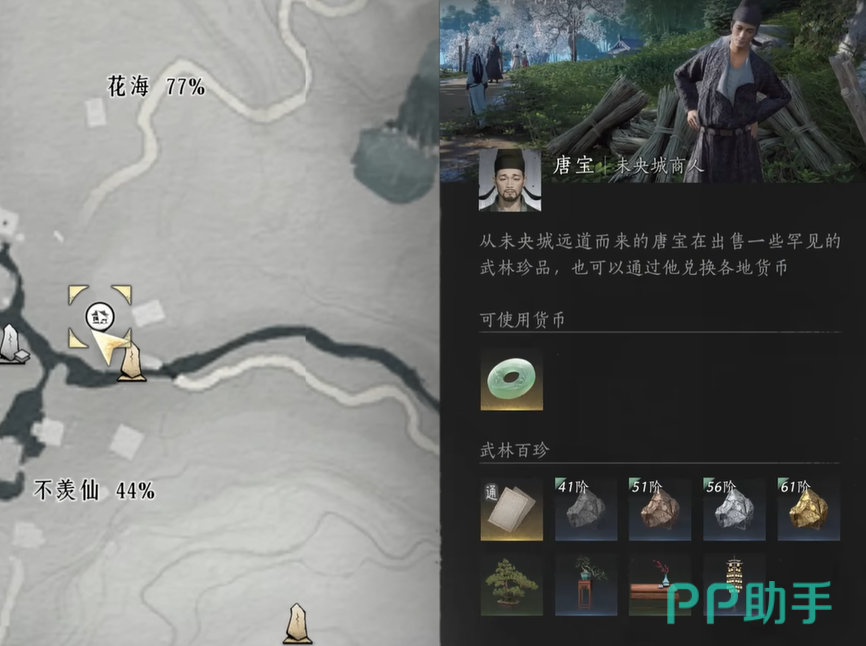 首先,你需要前往清河地图中的“不羡仙”附近。这一片区域风景清幽,极具诗意,但你可不是来赏景的。注意在一个牌楼旁边,有一位正在烤火的NPC,名为唐宝。他可是贩卖“易水歌”残页的重要角色。找到他后,与其交谈,选择查看他的商品清单。