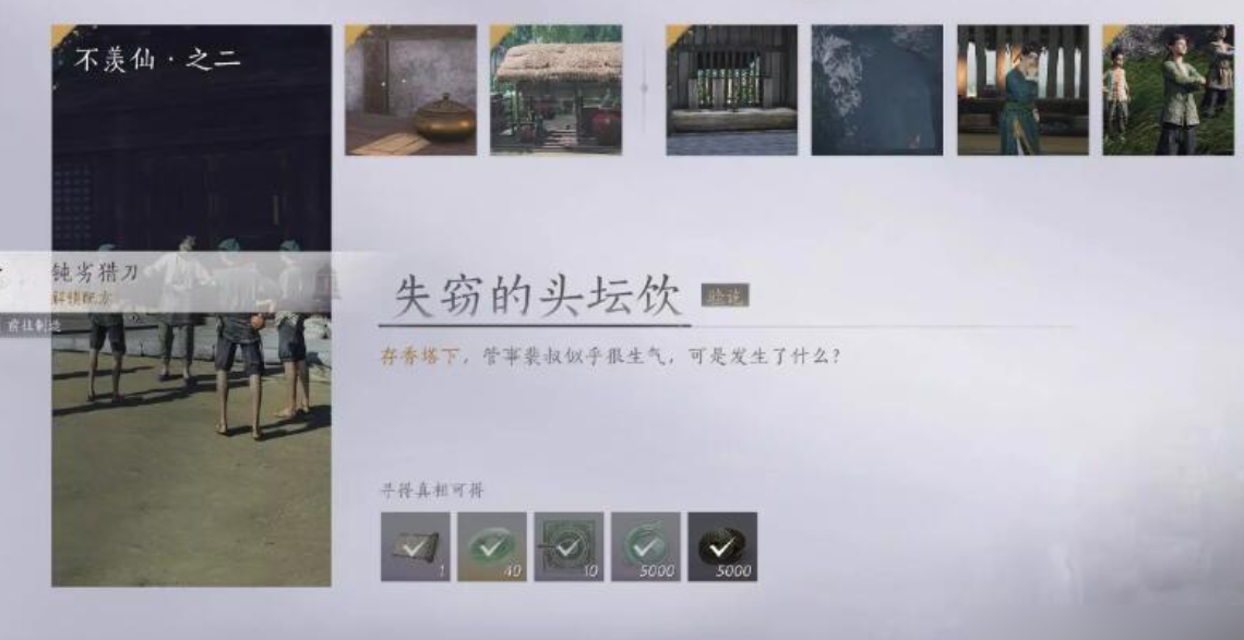失窃的头坛酒这个任务在完成之前先要触发任务,这时候玩家要去存香塔的下面找到npc裴酿,然后跟裴酿进行对话。通过对话,玩家已经知道头坛酒失窃,在这里就会触发任务,而玩家想要完成任务的时候,也需要看一下任务的提示。