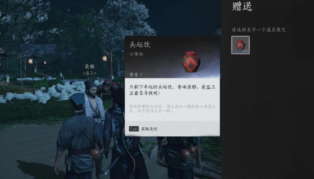 在提示当中需要玩家在存香塔的梨花树旁边找到一撮黄毛,这个黄毛其实是猿猴留下的线索,而通过这个黄毛玩家已经知道偷走头坛酒的是猿猴,然后玩家就根据猿猴留下的踪迹来到了花海右侧的山泉旁边,此时在石头上找到了被已经藏好的头坛饮,当玩家找到了头坛饮之后直接返回到存香塔下面,把它交给npc,就代表玩家完成了任务。