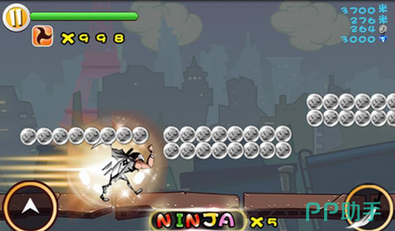 忍者追击虽然是一款跑酷类型的游戏,玩家进入游戏之后将会成为忍者,在各个城市的楼顶之间追逐邪恶的坏人,拯救被坏人带走的女孩。在追逐的过程当中会有跳跃,滑翔,冲刺等等动作。其实在追逐的时候也需要收集金币,毕竟这些金币能够让玩家的技能升级,角色能力得到提高。其实整个游戏的故事情节吸引玩家的注意,而整个游戏简单容易上手,目前适合各个年龄阶段的玩家。