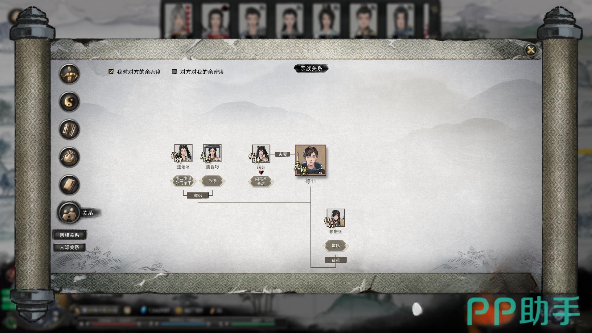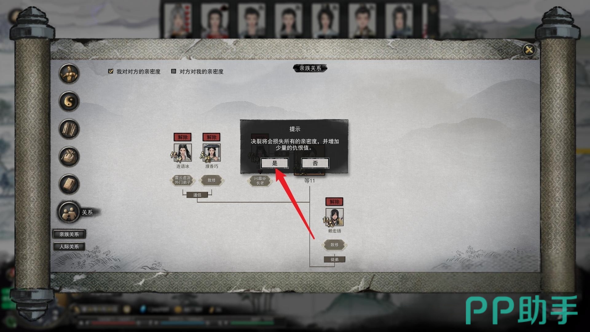 点击关系图标后,玩家将进入亲族关系界面。在这个界面中,玩家可以清晰地看到与每个NPC的具体关系状态。如果角色当前已经与某一位NPC结为道侣,那么该道侣会在界面中有明确的标识。此时,只需点击对应的道侣头像,便会出现一个选项,允许玩家选择解除道侣关系。需要特别注意的是,解除道侣关系是一个不可逆的行为,一旦确认操作,这段修仙旅程中的情缘将宣告终结,NPC的好感度也会因此下降。