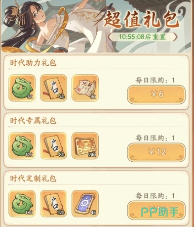 如果大家不想一次花这么多去购买月卡或者终身卡的话,游戏中还有一个超值礼包系统,大家可以在上面看到价格不一的礼包,基础的礼包价格低,但是给出的其实都是一些基础的资源,比如时代助理礼包最后价格只要6,但是给的就是60玉璧、40户口簿以及80地契,这个性价比不高,就是占了价格低的优势,其实这样的礼包如果大家只是想充值玉璧的话,还是可以考虑的,其他礼包里面赠送的道具就当是赠品。