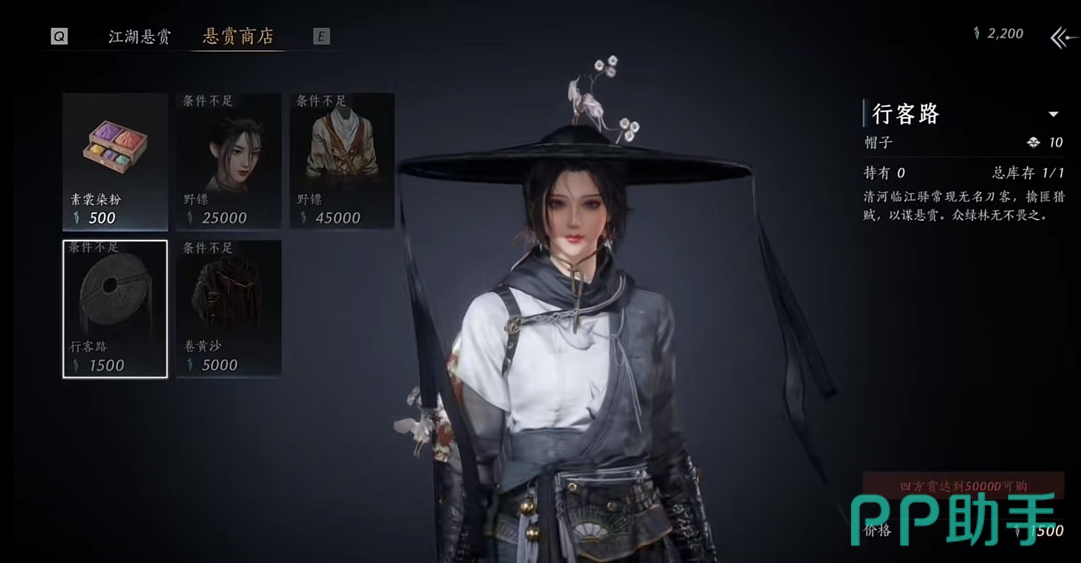如果大家平常喜欢做悬赏任务的话,就可以获得一定数量的悬赏金。这时你就可以打开悬赏商店,上面就陈列着斗笠。具体的名字叫做行客路,这顶帽子的衣不仅是装扮你的造型,更多的是彰显出你曾经处理过许多悬赏犯的证明。而且兑换条件也不苛刻,只需要花费1500悬赏币即可获取。