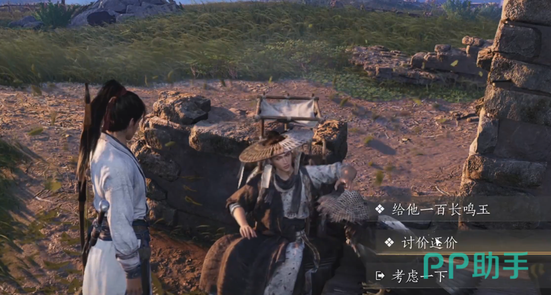 这个是在刚进入主线的时候能获得的隐藏成就,在跟着主线的路上,我们会遇到下图中这个天涯客,记得一定要和他进行对话,然后在对话的选项中选择给他100长鸣玉就可以获得了。